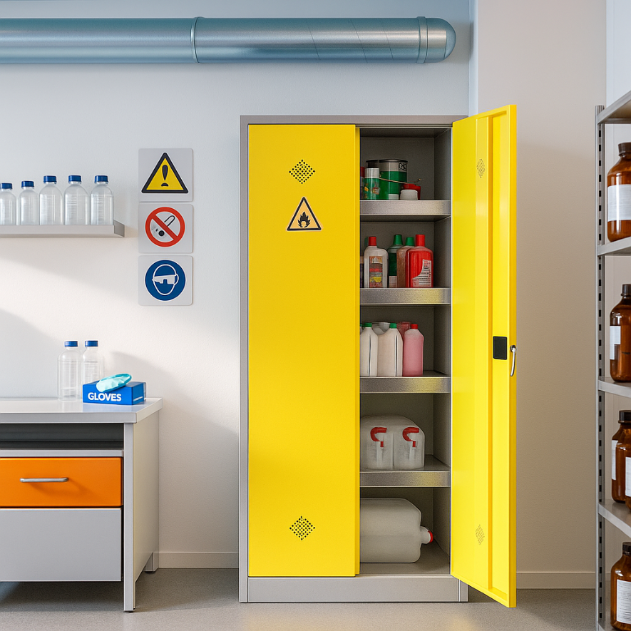 Parfait pour stocker vos produits chimiques et les produits dangereux tels que les solvants, peinture, produits d’entretien ou autres agents chimiques, notre armoire possède un renfort de porte et une fermeture à clé 2 points hauts et bas qui garantit la sécurité de votre matériel.