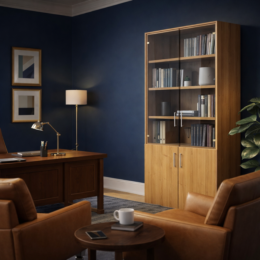 La partie haute est fermée par des portes vitrées en verre trempé, offrant une vue dégagée sur vos livres et documents tout en les protégeant de la poussière. La partie basse, équipée de portes pleines avec charnières de haute qualité, assure un rangement sécurisé pour vos fournitures et objets personnels. Disponible en finitions variées, telles que le chêne clair et l’érable, elle s’intègre harmonieusement dans tout décor de bureau.