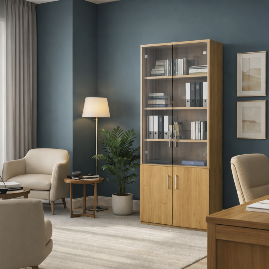 Les portes vitrées en verre trempé de la partie haute permettent de protéger vos livres et documents tout en les rendant facilement visibles. La partie basse est munie de portes pleines avec des charnières de qualité, offrant un espace de rangement sécurisé pour vos fournitures et effets personnels. Disponible en finitions variées, comme le chêne clair et l’érable, cette bibliothèque s’adapte parfaitement à différents styles de décoration.