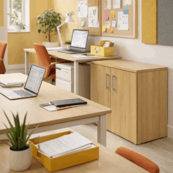 Elle est construite avec des panneaux de mélaminé robuste, mesurant 19 mm pour les portes et le fond, et 25 mm pour les côtés et le dessus, ce qui garantit une solidité à toute épreuve. Son design épuré et ses finitions, disponibles en chêne clair et érable, complètent n’importe quel décor de bureau.