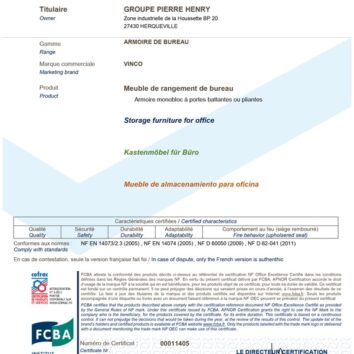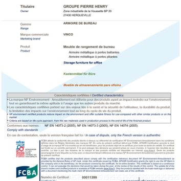Armoire conforme aux normes européennes et françaises : Certification NF Office Excellence, NF Environnement et GS .