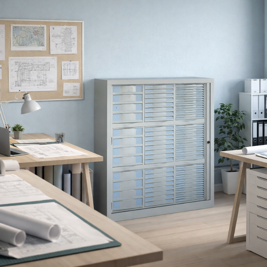 Notre catalogue propose une sélection de mobilier entièrement dédiées à l’armoire de bureau à rideaux. Avec un large choix en termes de taille et de profondeur, vous pouvez profiter d’un espace de rangement qui répond parfaitement à vos attentes. Chaque armoire proposée sur notre site répond à plusieurs normes et certifications propres au mobilier de bureau professionnel et atteste de leur qualité pouvant résister à 40 000 cycles d’ouverture et fermeture.