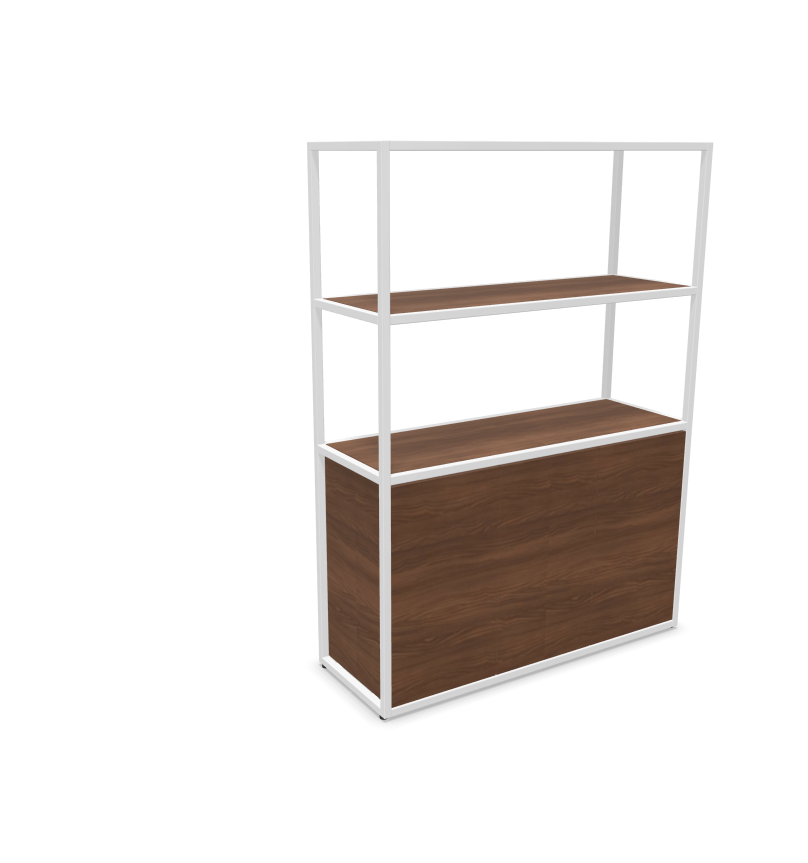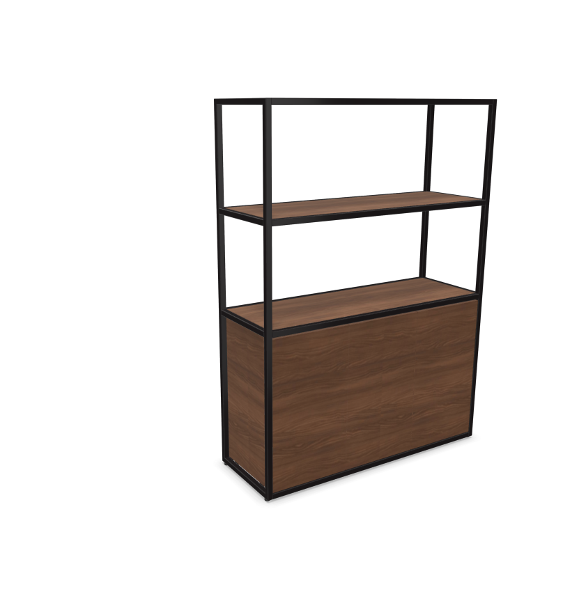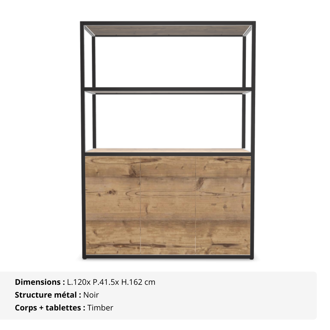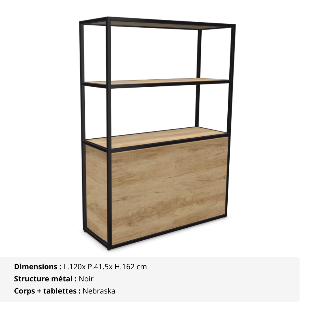 Sa structure tubulaire en acier (25 x 25 mm), déclinée en noir ou blanc époxy, lui assure une excellente stabilité et un design contemporain fluide. Le corps du meuble ainsi que les tablettes sont réalisés en panneaux mélaminés Structurex® d’épaisseur 16 mm, avec chants ABS antichoc, garantissant une bonne tenue dans le temps même en usage intensif.