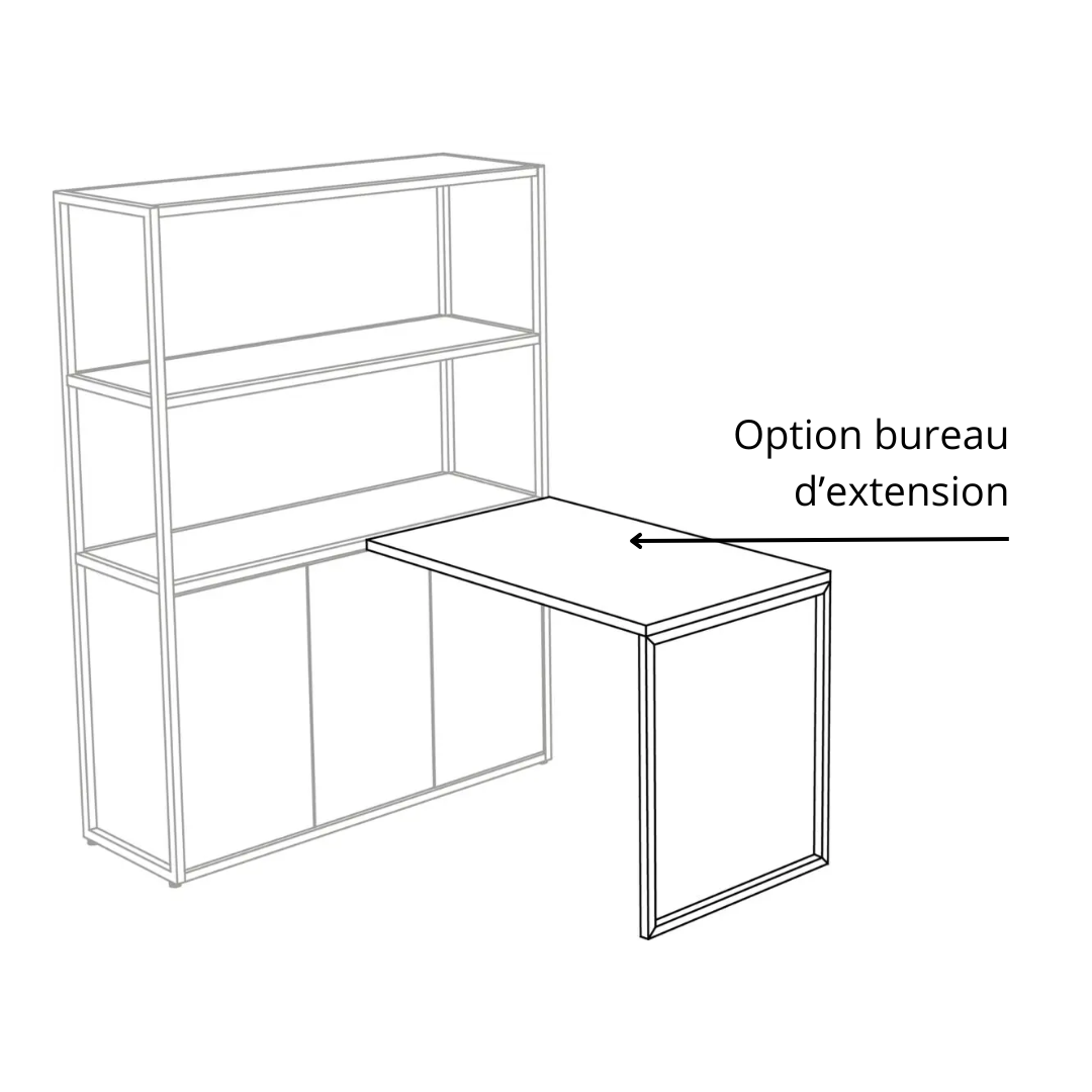 Cette bibliothèque peut être complétée par un bureau d’extension assorti, directement fixé sur la structure. Vous obtenez ainsi un poste de travail compact et fonctionnel, parfaitement intégré à votre aménagement. Ce système malin permet de gagner de la place tout en combinant rangements et surface de travail dans un seul meuble.
