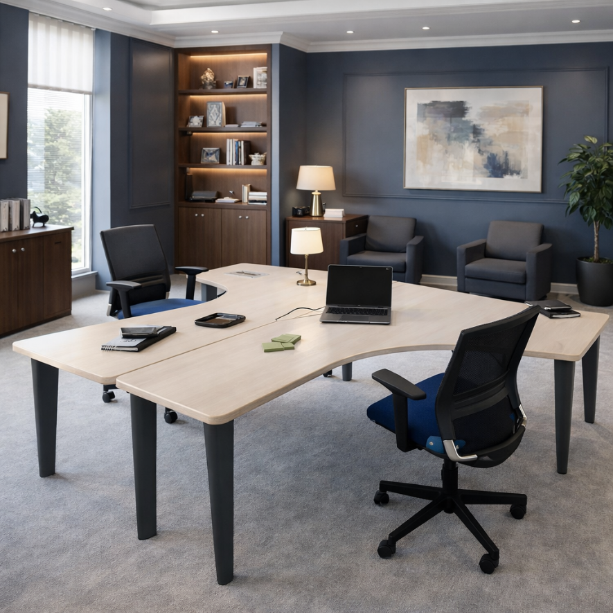 Idéal pour 2 personnes. Sa forme élégante et équilibrée maximise l’espace tout en favorisant la collaboration. Sa forme équilibrée et moderne permet une utilisation efficace de chaque centimètre, tout en offrant un design élégant et fonctionnel, parfaitement adapté à tout environnement professionnel.