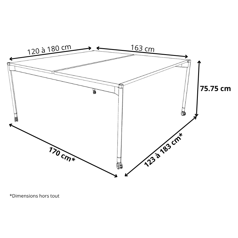 Les dimensions s’ajustent selon vos besoins : largeur de 120 à 180 cm, profondeur totale de 170 cm, pour une hauteur de 78.5 cm avec roulettes.