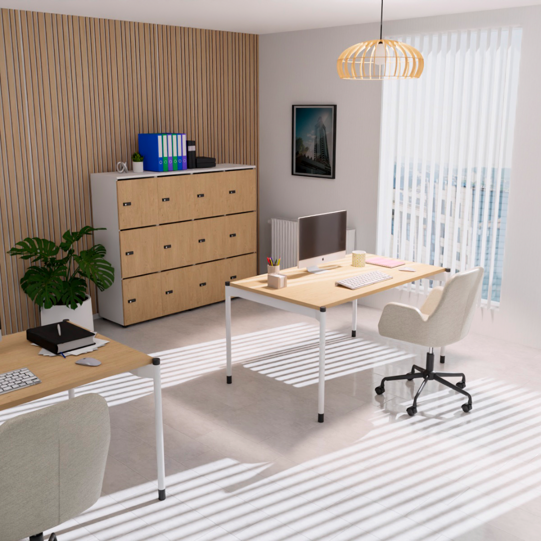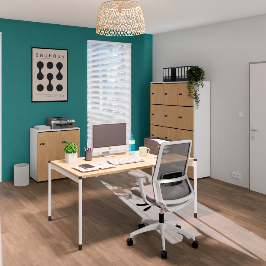 C’est le choix idéal pour aménager des espaces de travail modernes, pratiques et durables. Grâce à ses 4 dimensions hors tout (L. 123, 143, 163 ou 183 cm), il s’adapte à tous les environnements, du bureau individuel aux open-spaces.