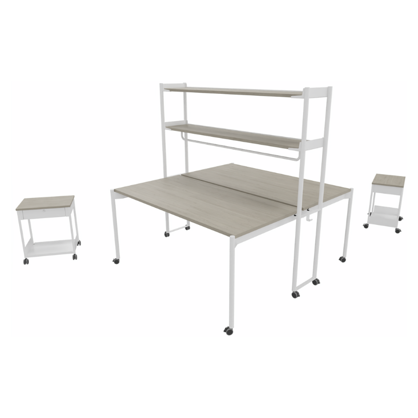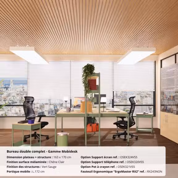 Le bureau double complet Mobidesk est pensé pour offrir un espace de travail optimisé, adapté aux PME, indépendants et espaces de coworking. Il comprend :