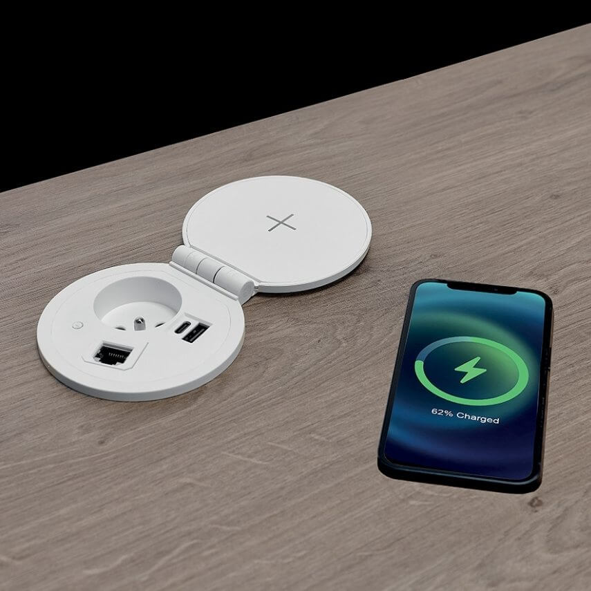 Obturateur électrifiable : pré-installation facilitée avec un module comprenant 1 prise 220V, 1 port USB-A, 1 port USB-C et 1 prise RJ45, idéal pour connecter vos équipements sans encombrer votre espace.