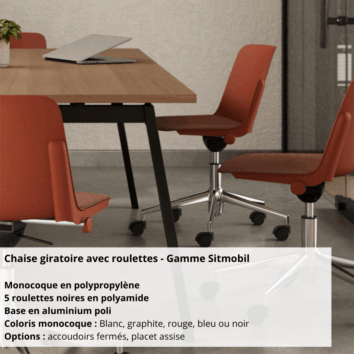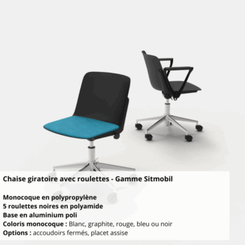 Choisir la chaise giratoire avec roulettes – Gamme Sitmobil, c’est investir dans un mobilier ergonomique, fonctionnel et résistant, pensé pour accompagner vos activités professionnelles avec efficacité et confort.