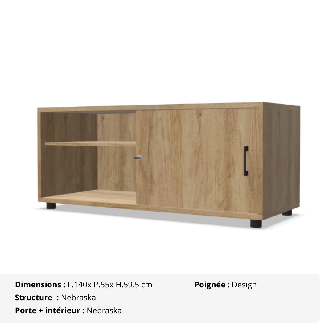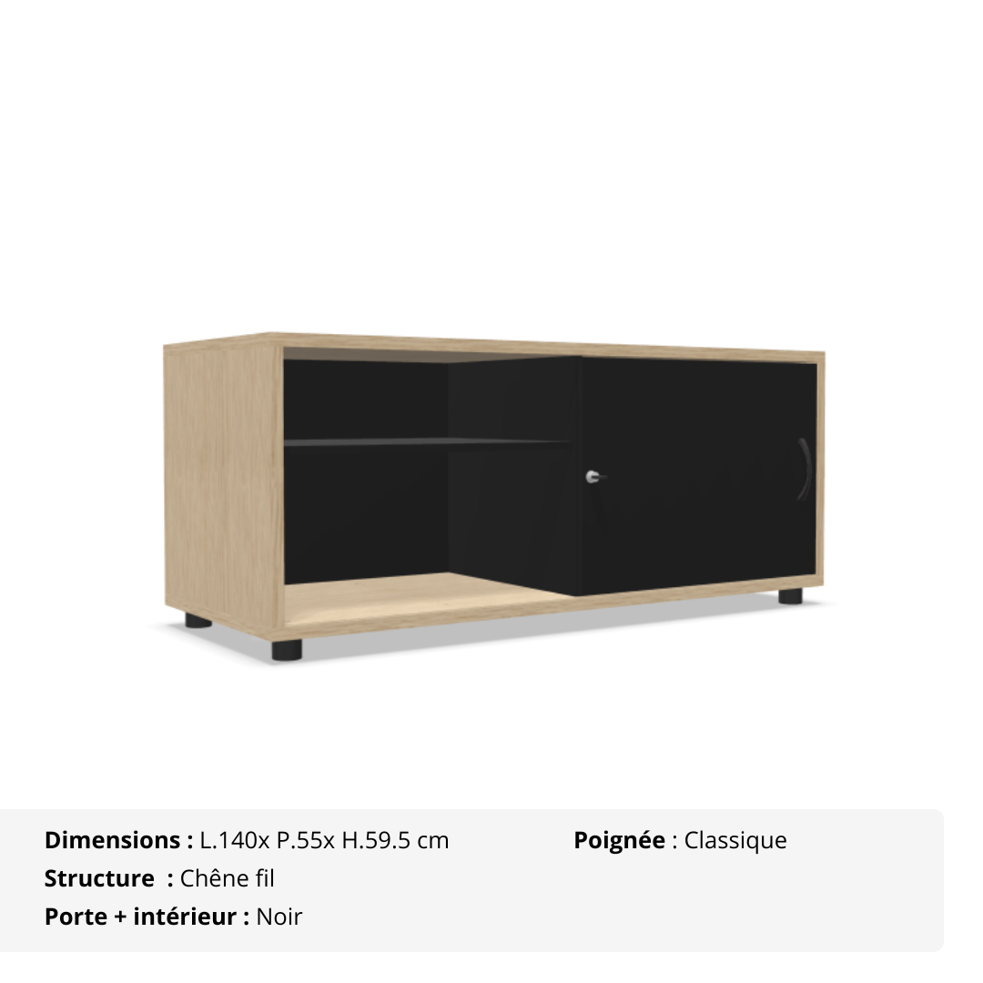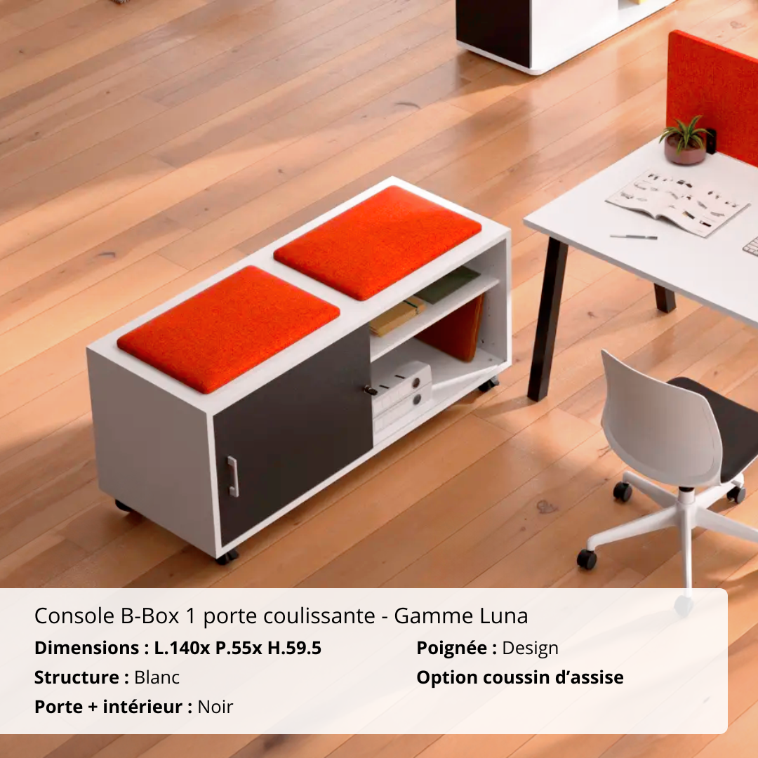 Compacte, élégante et pensée pour optimiser les petits espaces, la console B-box 1 porte coulissante s’adapte facilement à tous les environnements professionnels. Son format pratique (L 140 x P 55 x H 59,5 cm, ou H 63,5 cm avec roulettes) lui permet de se glisser dans un bureau, une salle de réunion ou une zone de passage.