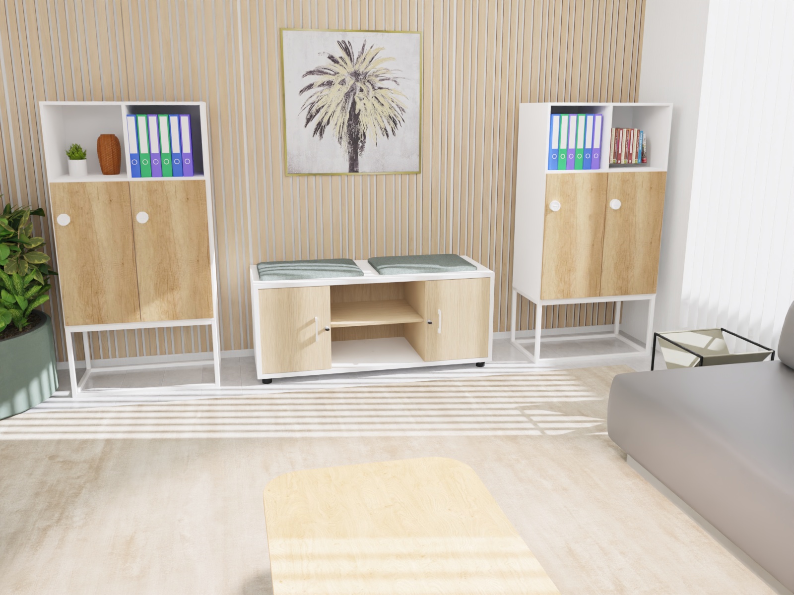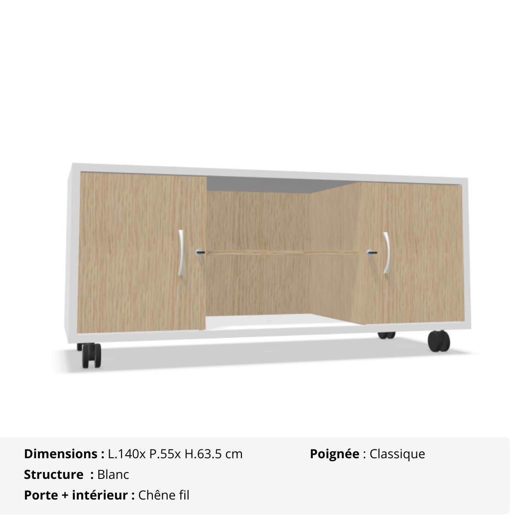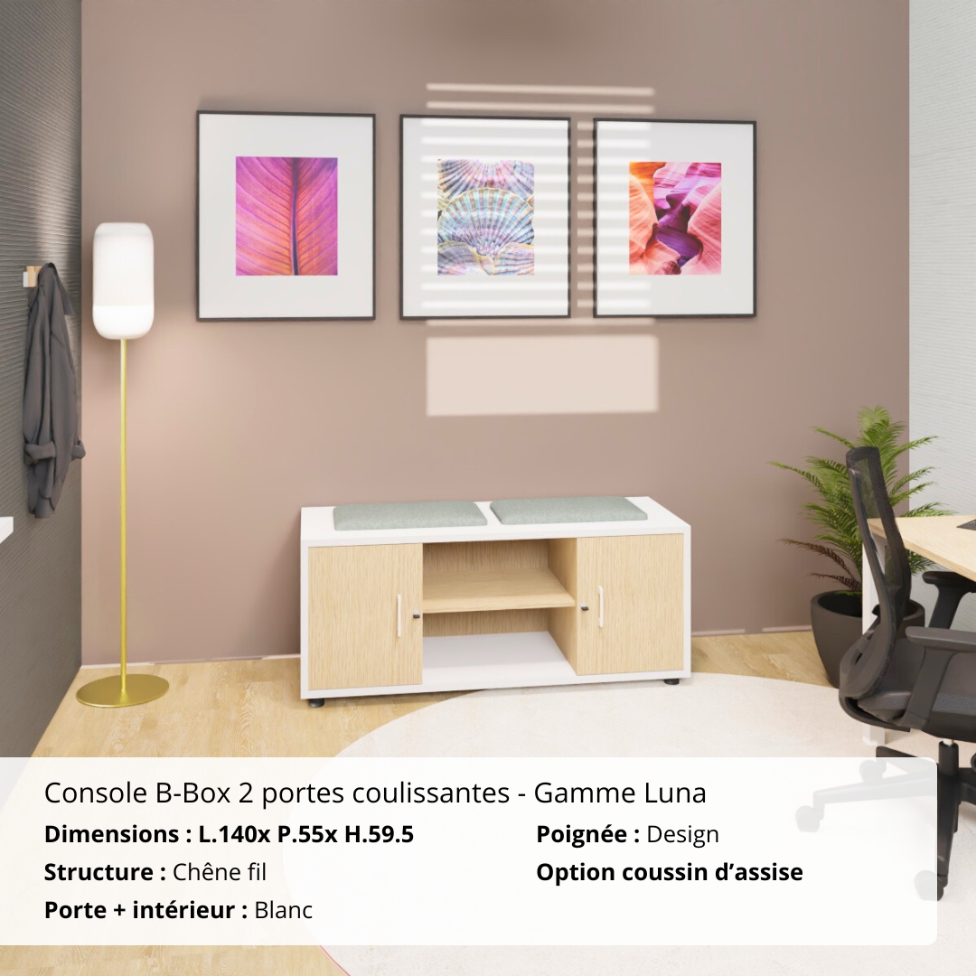 Pensée pour ceux qui cherchent une solution de rangement plus structurée, la console B-box à 2 portes coulissantes se distingue par sa capacité d’organisation et son design discret. Avec ses dimensions L 140 x P 55 x H 59,5 cm (H 63,5 cm avec roulettes), elle offre un agencement intérieur complet.