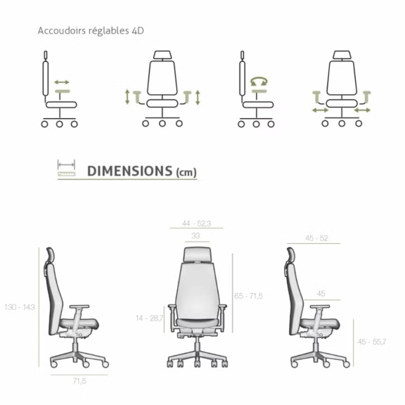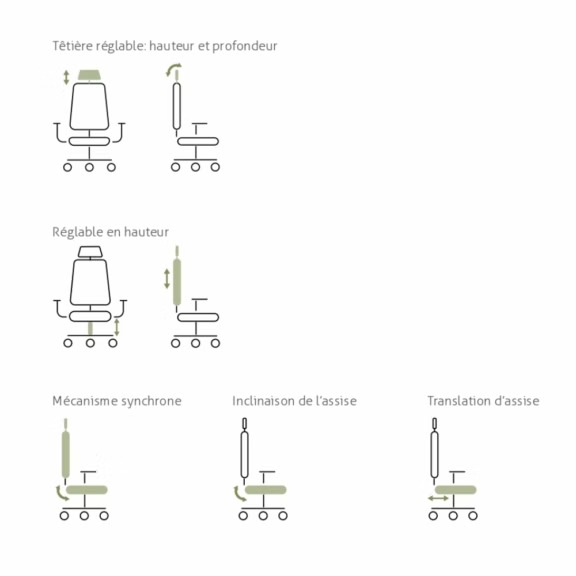 - Des réglages ergonomiques complets (hauteur, profondeur, accoudoirs, inclinaison)