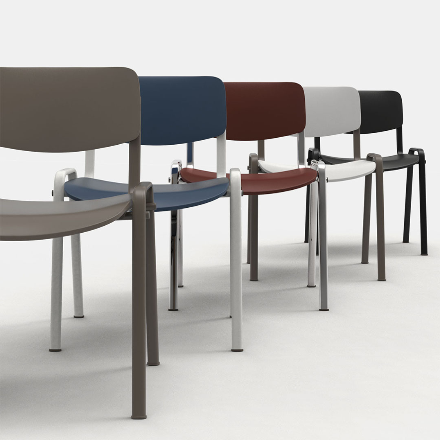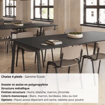 Sa structure métallique solide, disponible en finition noire, blanche, marron ou chromée, assure stabilité et longévité. Grâce à son design sobre et fonctionnel, Ecosit s’intègre dans de nombreux environnements : salles de réunion, formations, cafétérias, zones d’accueil ou collectivités.