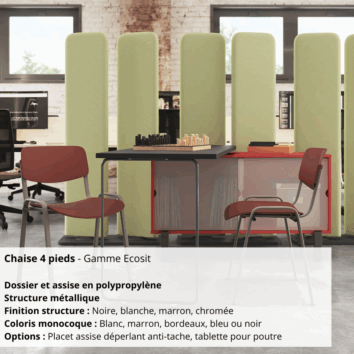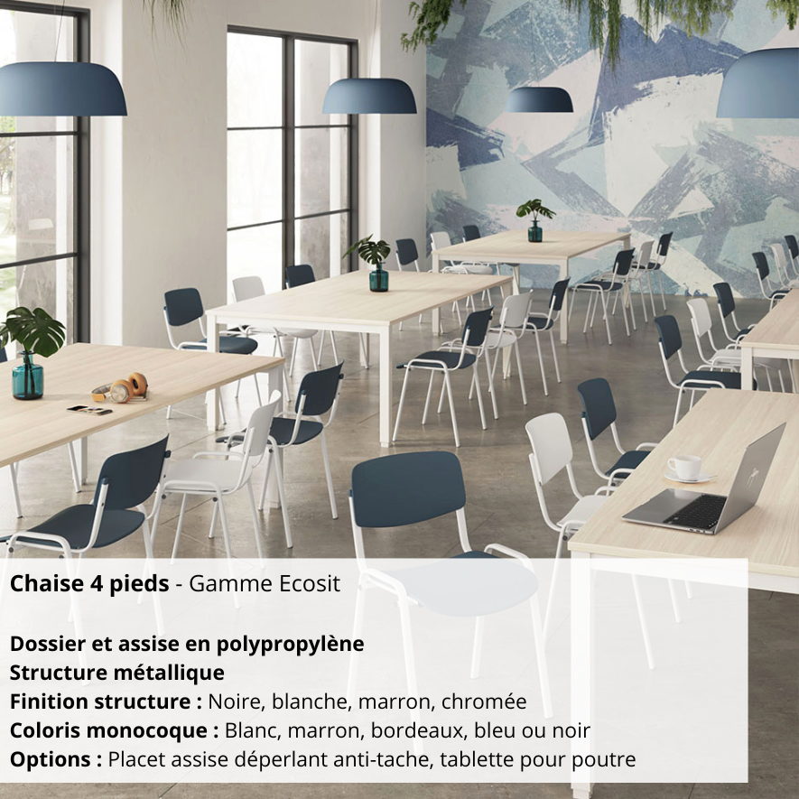La chaise 4 pieds – Gamme Ecosit est la solution idéale pour équiper vos espaces collectifs avec un mobilier économique, pratique et durable. Son dossier et son assise en polypropylène offrent un confort simple et un entretien facile, parfaits pour un usage quotidien intensif.