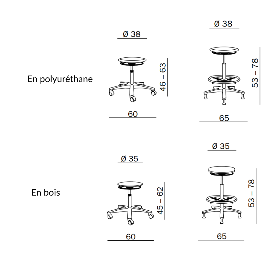 Le piètement en étoile garantit une stabilité optimale et peut être équipé de roulettes ou de patins selon le type de sol. La version avec repose-pieds apporte un appui supplémentaire, idéal pour les postes de travail en hauteur.