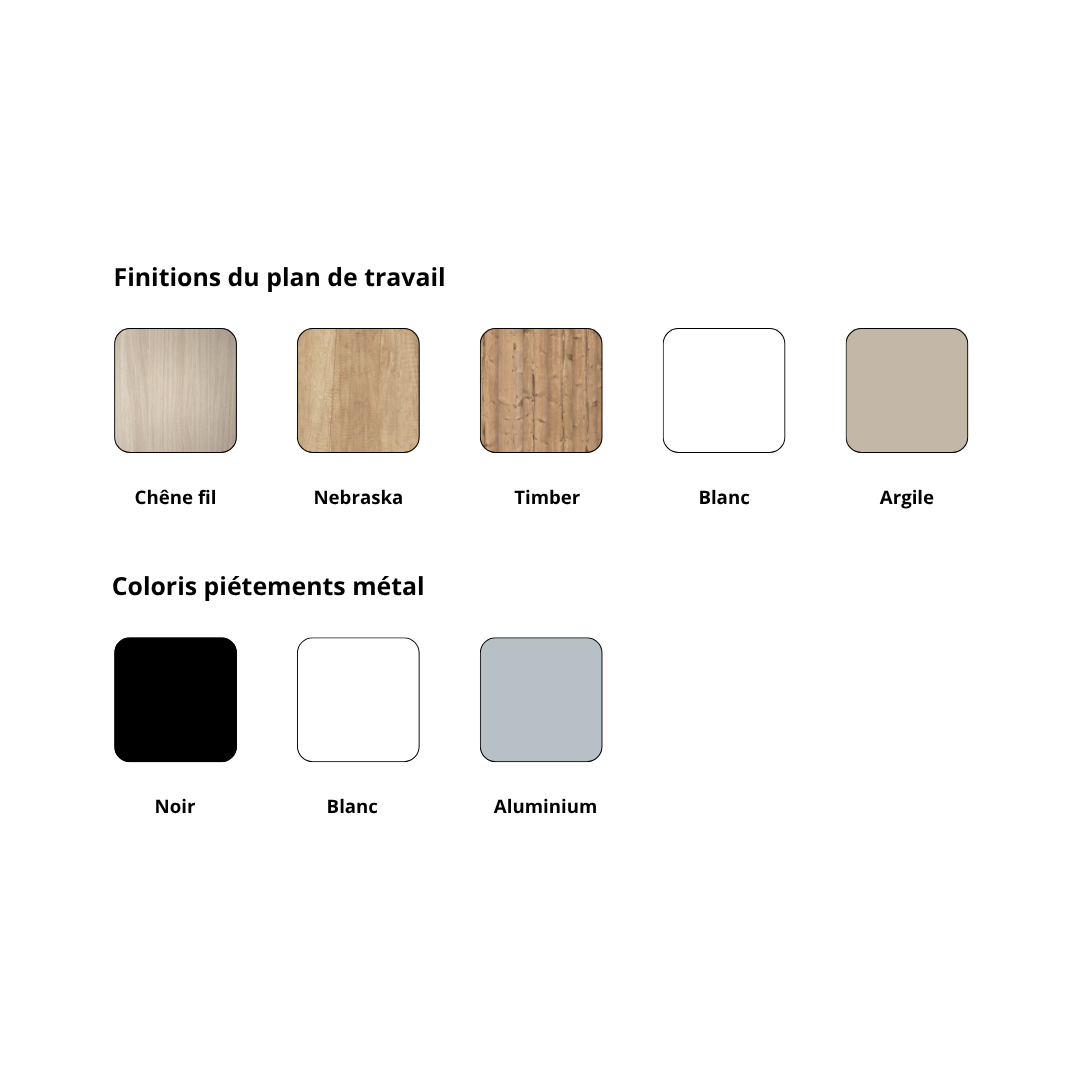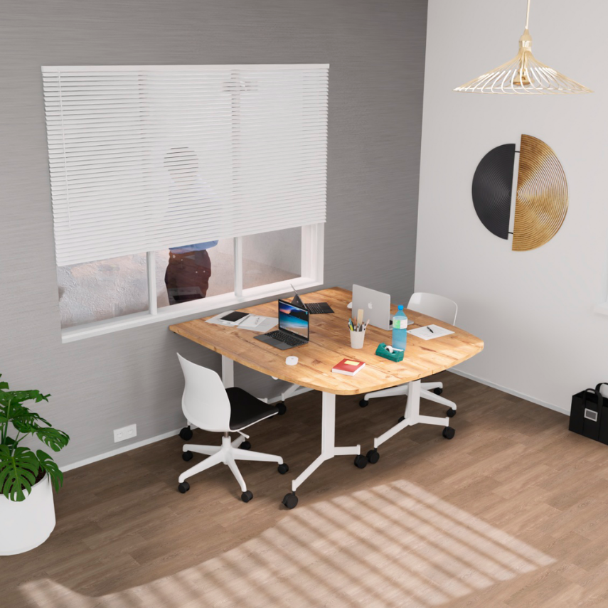Le plateau en panneau mélaminé Structurex®, épaisseur 25 mm, est bordé de chants ABS anti-choc, assurant une résistance durable. Sa forme asymétrique adoucit l’agencement et permet des transitions visuelles naturelles dans l’espace.
