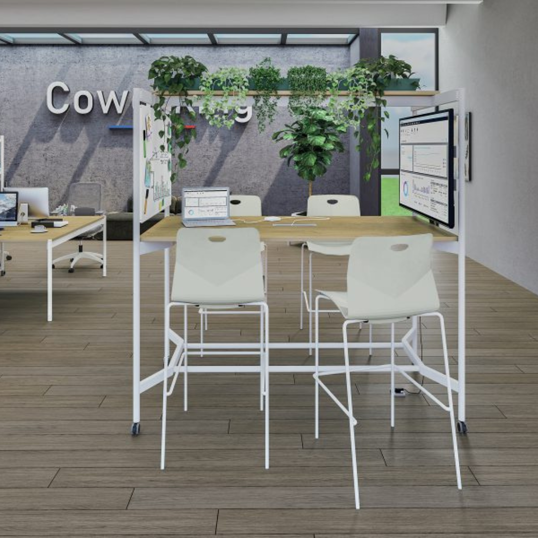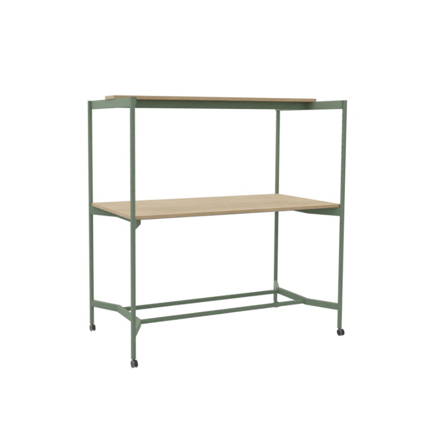 Idéale pour les zones partagées, les réunions informelles ou les projets collaboratifs, cette table haute se déplace facilement grâce à se 4 roues avec frein. Elle combine un large plan de travail (180 x 90 cm, hauteur 107 cm) avec une structure haute intégrant un second plateau, pratique pour y poser des plantes ou des éléments de décorations.