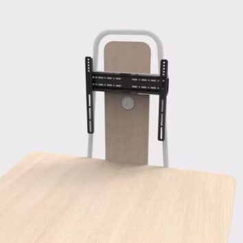 Grâce à son support écran compatible VESA (75×75 à 400×400 mm) (« compatible VESA » veut dire que l’écran peut être fixé sur un support avec des trous de vis aux normes standardisées), cette table accueille des écrans jusqu’à 43 pouces (23 kg), parfait pour diffuser une présentation ou animer une visio. L’écran se fixe solidement au panneau vertical, dissimulant proprement le câblage via une goulotte verticale arrière en PET recyclé.