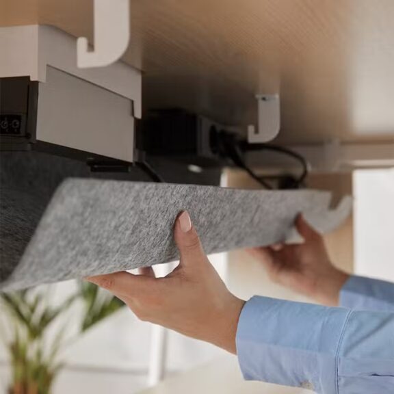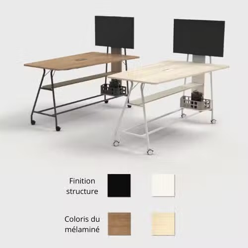 Grâce à son support écran compatible VESA (75×75 à 400×400 mm) (« compatible VESA » veut dire que l’écran peut être fixé sur un support avec des trous de vis aux normes standardisées), cette table accueille des écrans jusqu’à 43 pouces (23 kg), parfait pour diffuser une présentation ou animer une visio. L’écran se fixe solidement au panneau vertical, dissimulant proprement le câblage via une goulotte verticale arrière en PET recyclé.