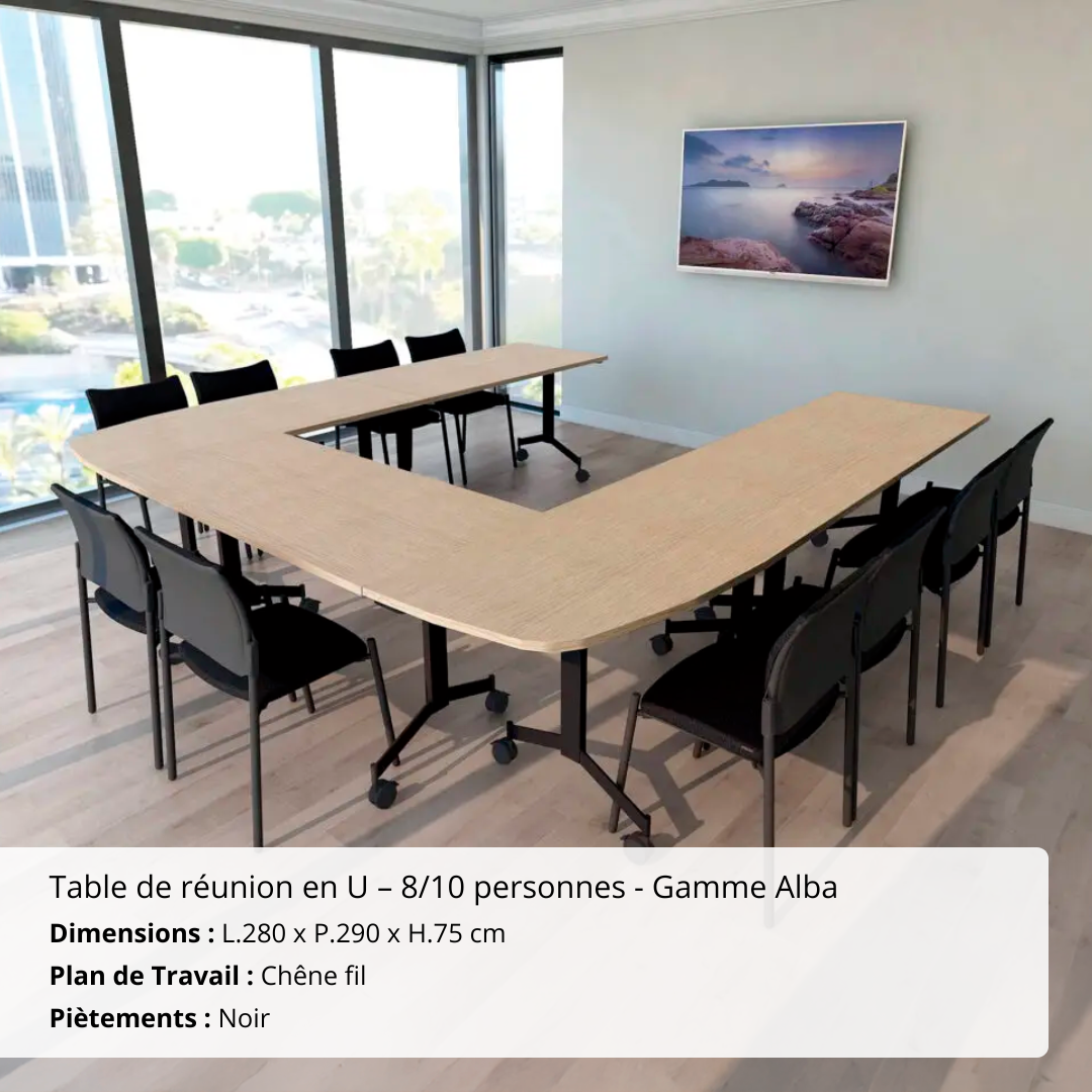 Conçue pour allier fonctionnalité, mobilité et design, cette configuration en U se compose de 5 tables abattantes : trois tables droites au centre et deux tables avec angles intégrés à gauche et à droite, permettant de créer un espace de réunion fluide et professionnel.
