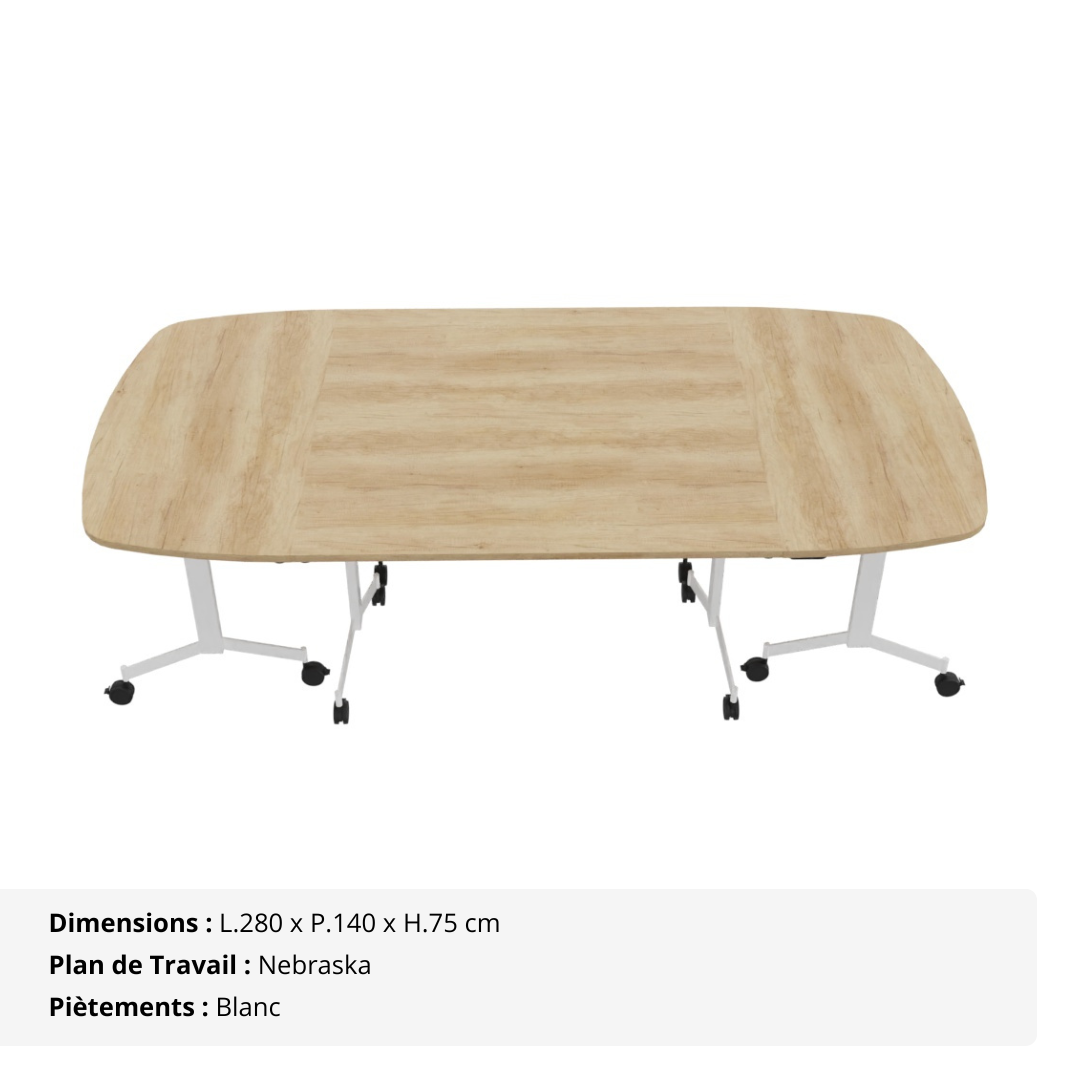 Composée de deux tables droites (L 140 x P 70 cm) et de deux tables demi-lune (L 140 x P 70 cm), cette table de réunion abattante ovale est idéale pour accueillir 8 à 10 personnes dans un cadre professionnel, modulable et esthétique.