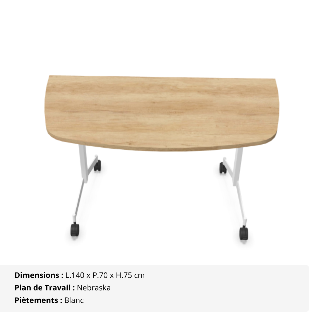 Pensée pour les agencements dynamiques et évolutifs, cette table demi-lune abattante offre une solution aussi esthétique que fonctionnelle pour équiper vos salles de réunion, de formation ou d’accueil. Sa forme arrondie favorise les configurations conviviales et les aménagements collectifs en arc de cercle ou en poste individuel.