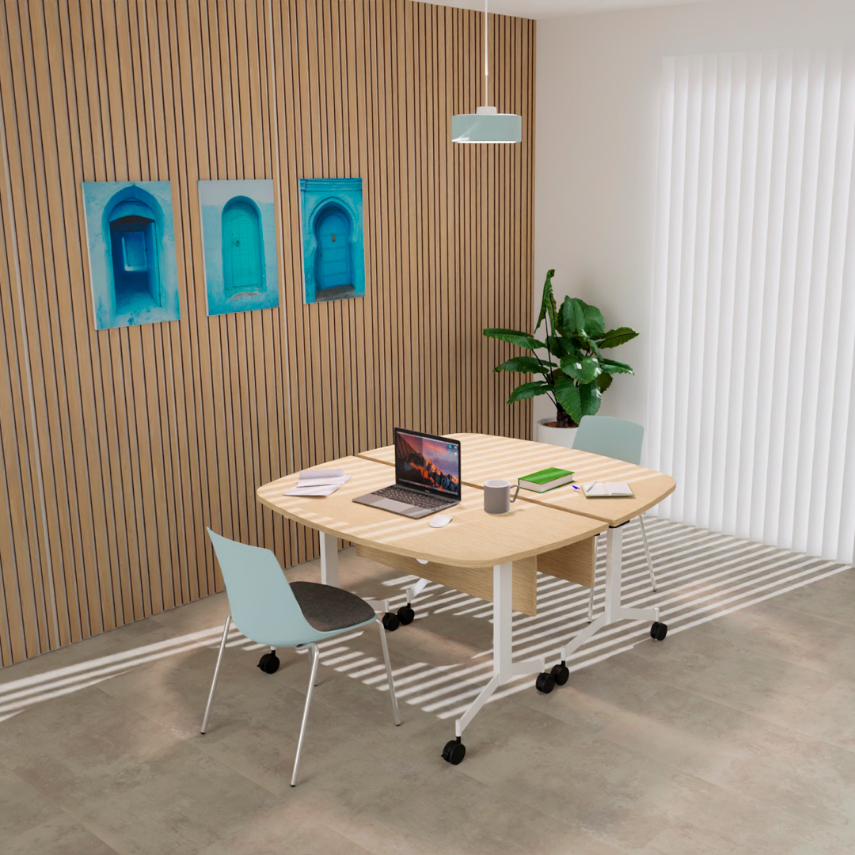 Son mécanisme de bascule simple et sécurisé permet de passer rapidement de la position de travail à un rangement vertical. L’action est fluide grâce aux poignées de blocage intégrées, et les piétements s’emboîtent pour optimiser l’espace de stockage : seulement 19,5 cm de profondeur supplémentaire par table ajoutée.