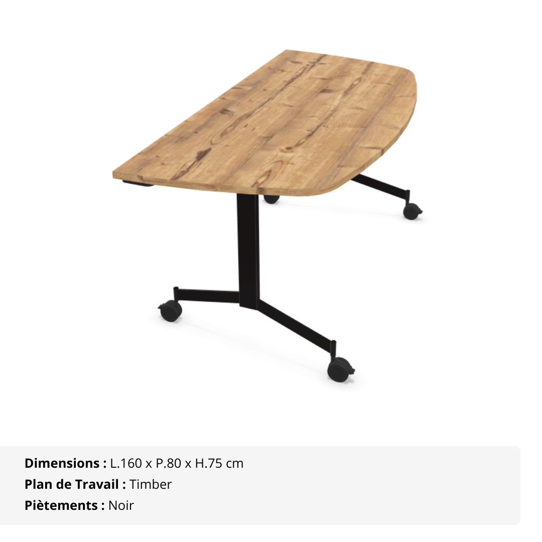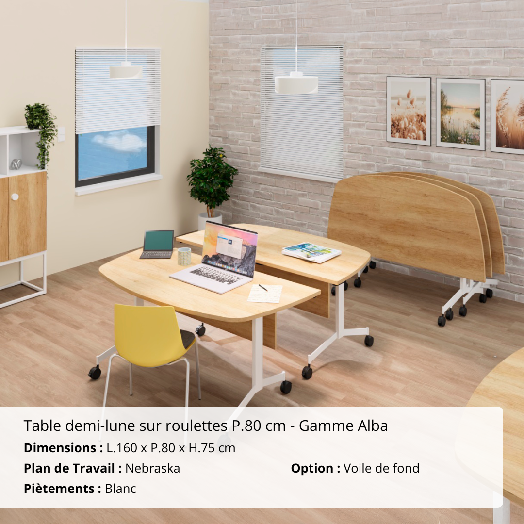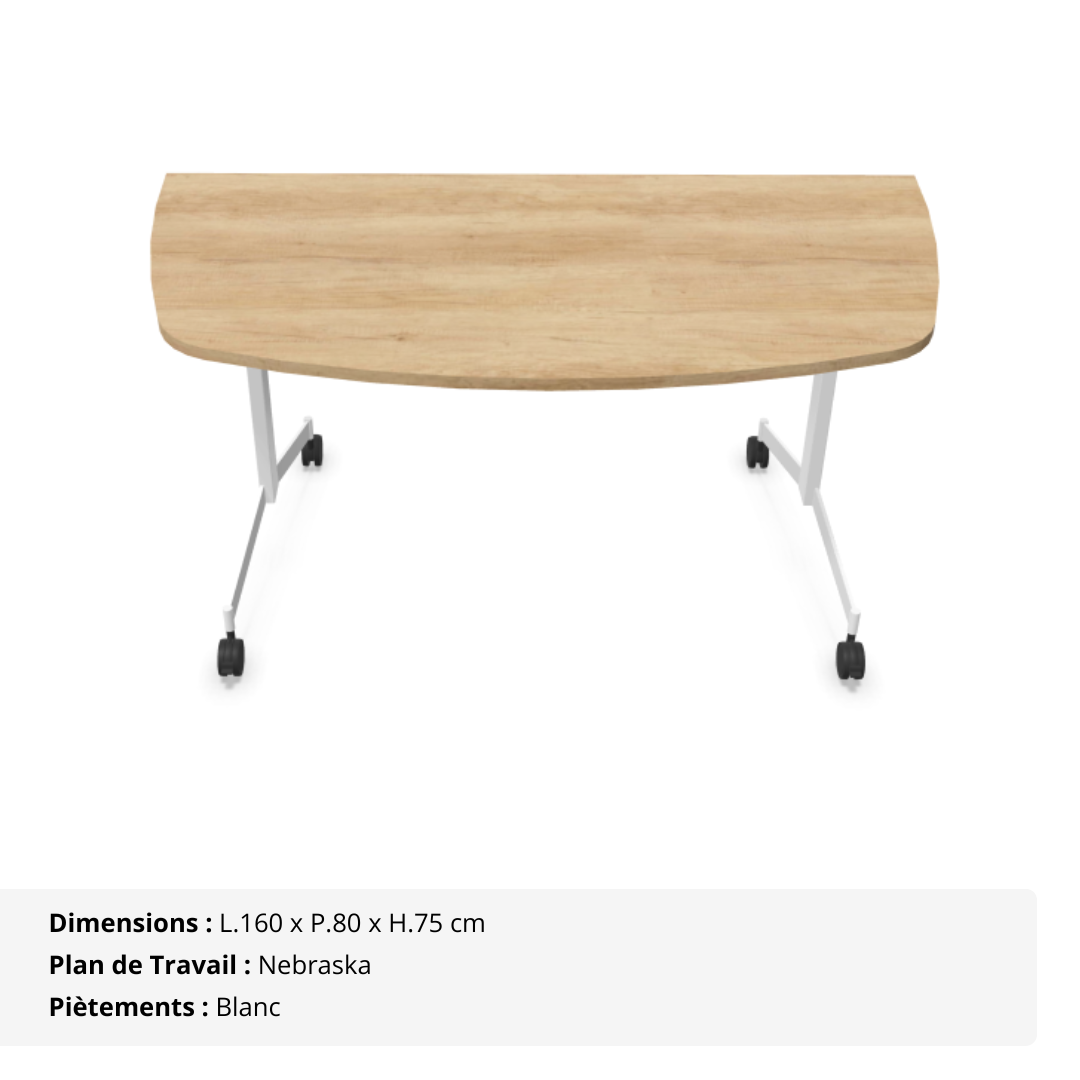 Spacieuse et mobile, cette table demi-lune abattante de 80 cm de profondeur est conçue pour accompagner les environnements professionnels en constante évolution. Sa forme arrondie permet de créer des configurations collaboratives, qu’il s’agisse de réunions en petit comité, d’ateliers ou de zones d’accueil. Grâce à sa profondeur généreuse, elle offre une surface de travail confortable tout en conservant une grande maniabilité.