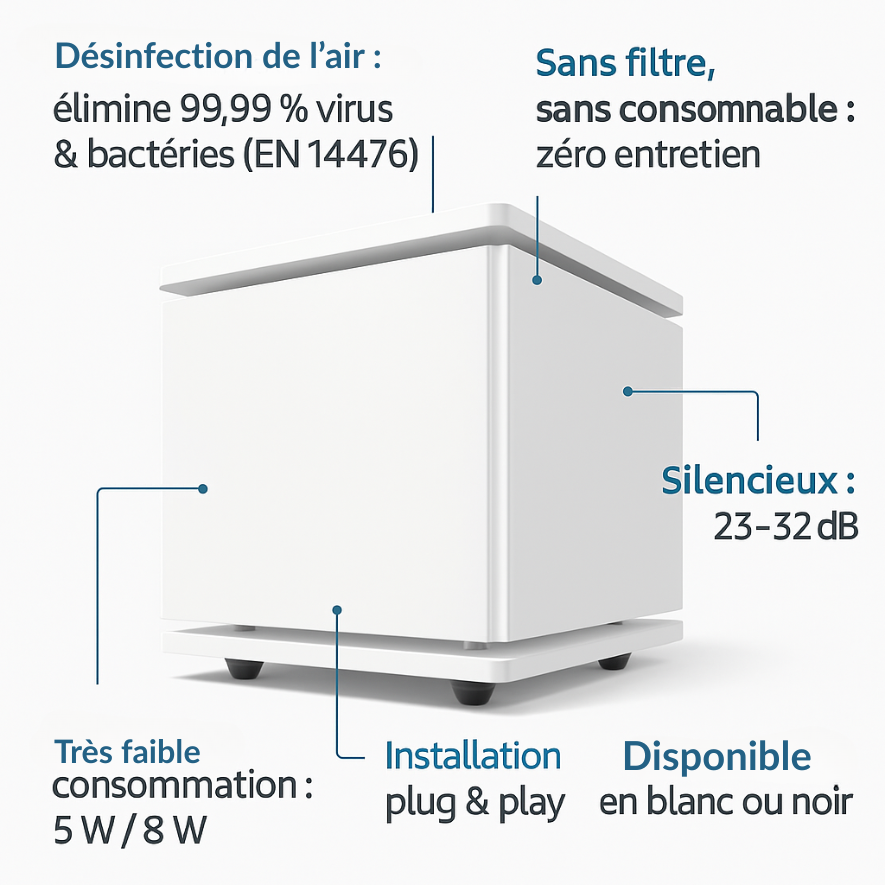 Il agit en présence des occupants, de manière continue et silencieuse, pour purifier les zones fréquentées ou mal ventilées.