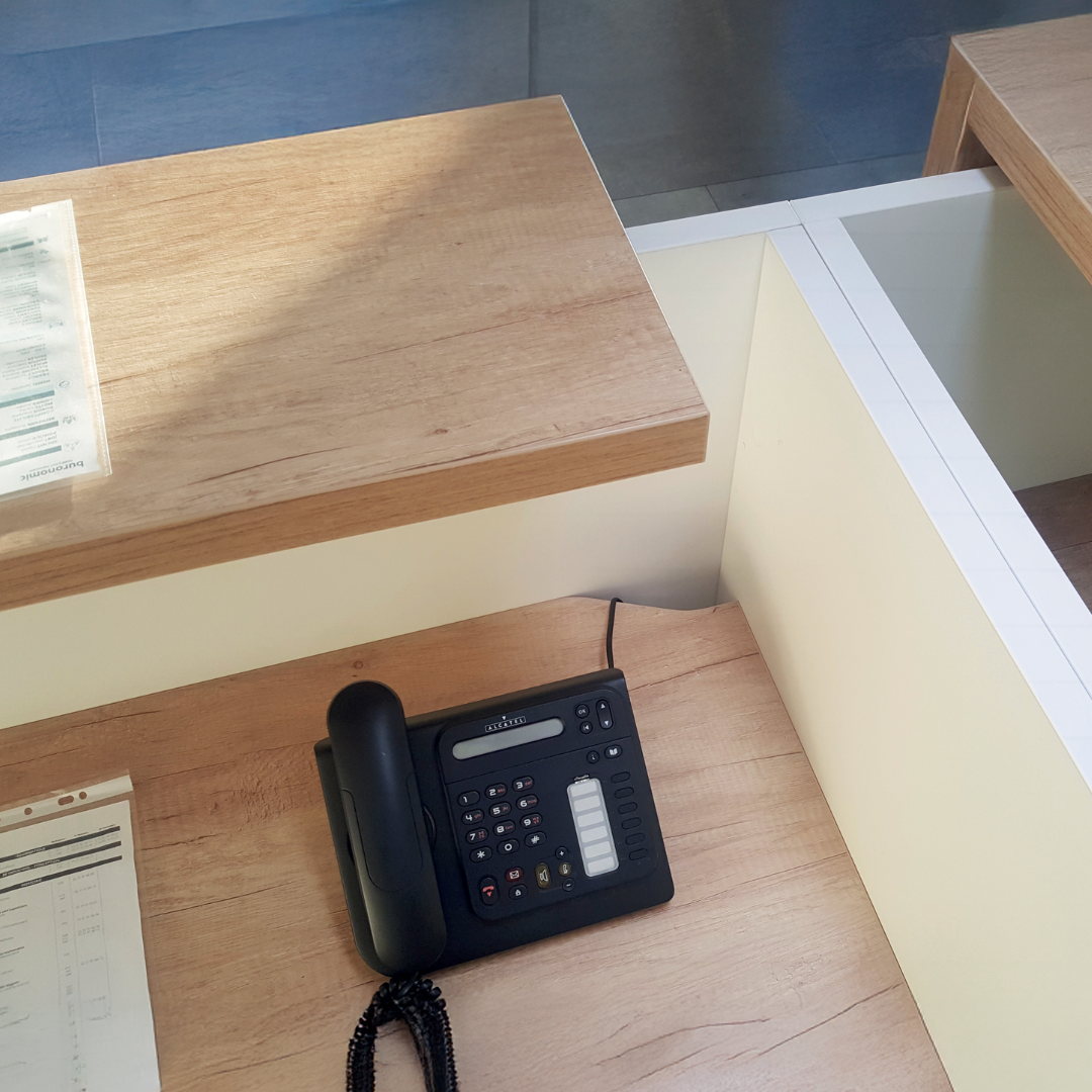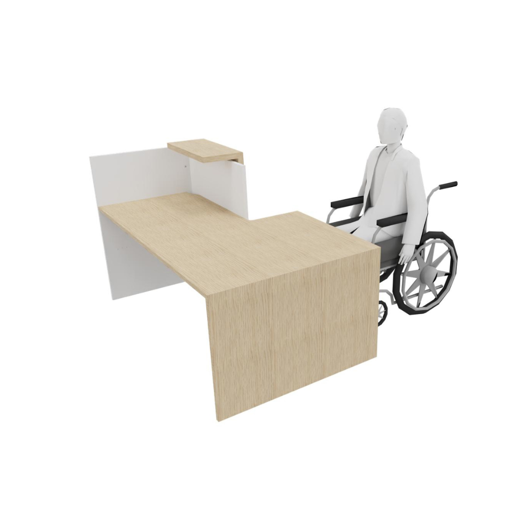 L’ergonomie n’est pas en reste : cette banque d’accueil est dotée de découpes précises sur le plateau et la façade, favorisant une circulation fluide des câbles vers le sol et évitant tout désordre visuel. Le passage de fauteuils roulants est naturellement intégré dans son design, avec un espace adapté pour offrir un accueil PMR fluide et respectueux, à hauteur accessible pour tous.