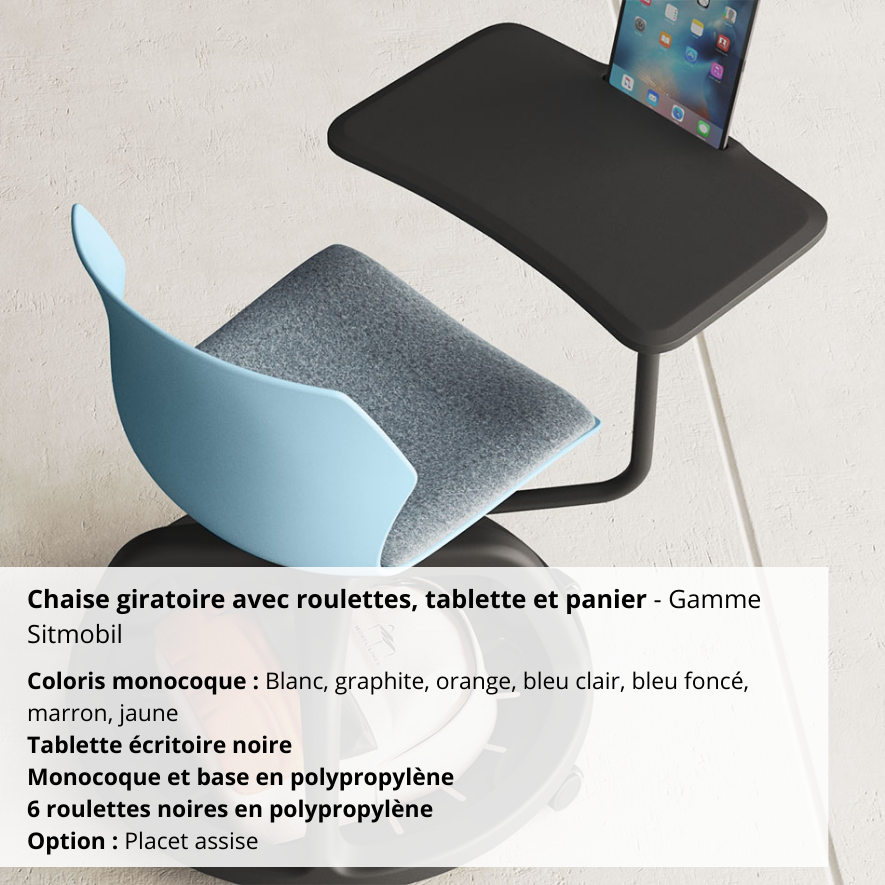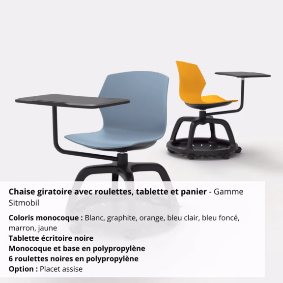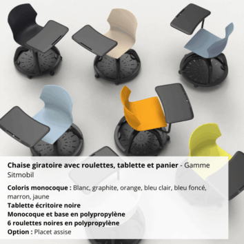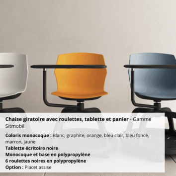 La chaise giratoire avec roulettes, tablette et panier – Gamme Sitmobil n’est pas qu’un simple siège : c’est un outil de travail complet, pensé pour transformer vos espaces collectifs en lieux dynamiques, flexibles et collaboratifs.