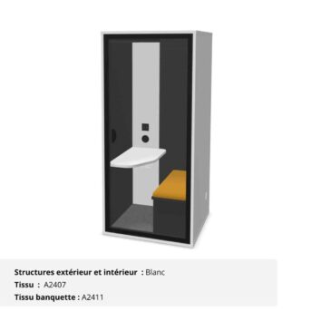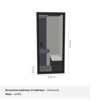 Avec ses dimensions optimisées (L.96 x P.95 x H.212 cm à l’extérieur, 87 x 83 x 198 cm à l’intérieur), cette cabine offre une surface au sol réduite (0,9 m²) tout en garantissant un espace de travail confortable et fonctionnel. Son banquette intégrée (88 x 38 cm à 45 cm de hauteur) et sa tablette ergonomique (43 x 79 cm à 73 cm de hauteur) permettent d’installer un poste de travail agréable et efficace, où chaque élément est pensé pour favoriser une posture idéale.