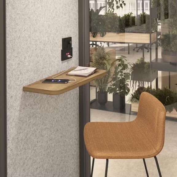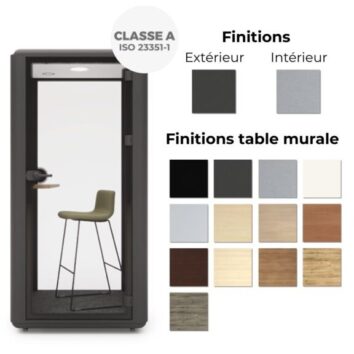 Cette cabine est idéale pour les utilisateurs nomades ou les collaborateurs ayant besoin de confidentialité ponctuelle. Elle peut être associée à des tabourets pieds traîneau ou réglables, et personnalisée avec plusieurs options : support écran, tableau blanc, ou encore porte-manteau intérieur et extérieur.