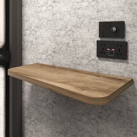Avec son format compact, elle s’intègre facilement dans les bureaux contemporains sans encombrer l’espace. Elle est livrée avec une table murale en mélaminé, personnalisable parmi 13 coloris, et bénéficie d’une finition soignée : extérieur en métal graphite et intérieur en PET gris clair, pour une ambiance douce et chaleureuse.