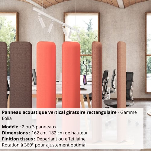Doté d’une structure métallique robuste, disponible dans plusieurs finitions, le panneau Eolia s’intègre naturellement dans tout environnement professionnel. Que ce soit en open space, en bureau partagé ou en salle de réunion, il allie esthétique et fonctionnalité pour réduire les nuisances sonores et améliorer la concentration.