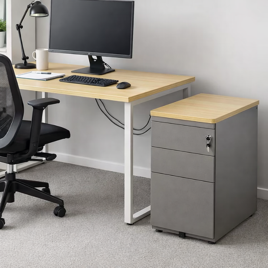 - Tiroir dossiers suspendus sur glissières télescopiques à extraction totale (profondeur 70 cm pour le caisson pf.80 cm). Coulissement sur glissières à billes. Ce tiroir est équipé d’une roulette (système antibasculant). Volume de classement : 60 dossiers (2 rangées de DS, accès frontal ou latéral)