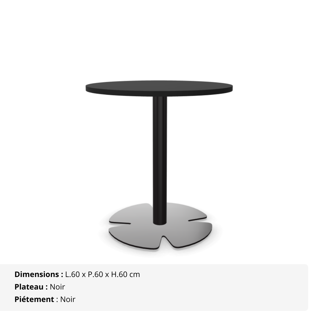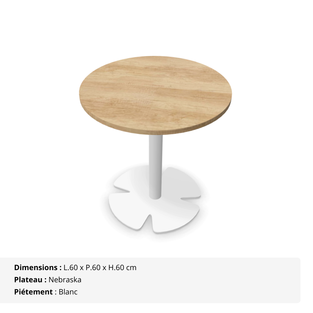 Son plateau rond de 60 cm en panneau mélaminé (épaisseur 16 mm) est bordé de chants ABS anti-choc, pour un usage quotidien en toute tranquillité. Le piétement central en tube d’acier Ø 60 mm, associé à une base quadrilobe en métal Ø 440 mm, assure une stabilité parfaite, sans alourdir l’ensemble visuellement.