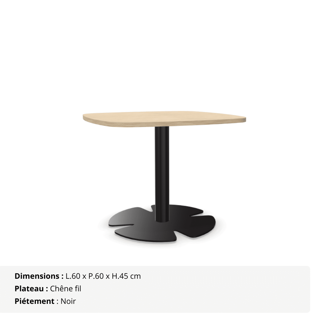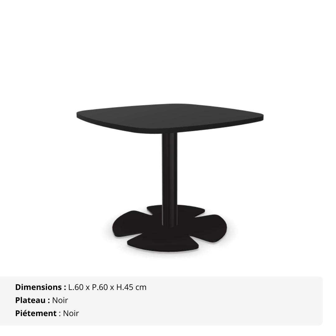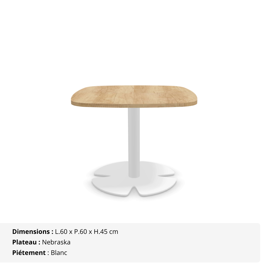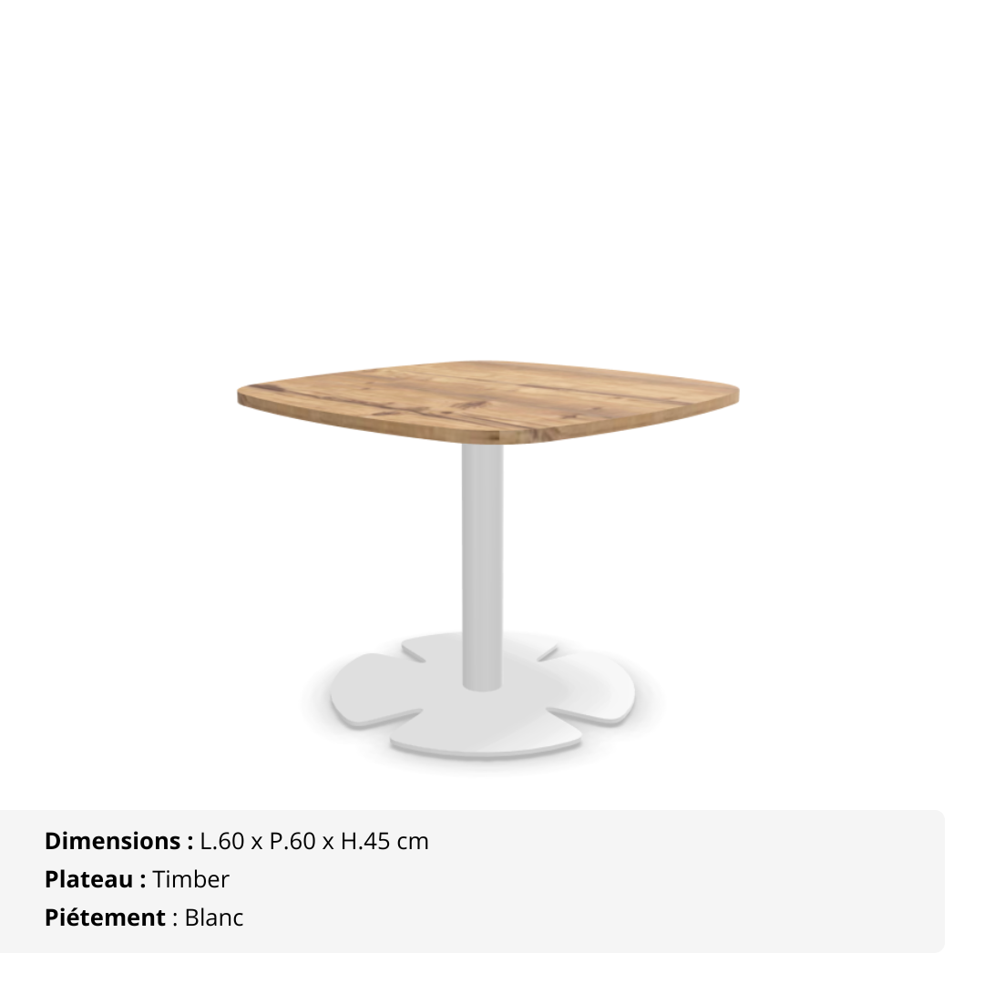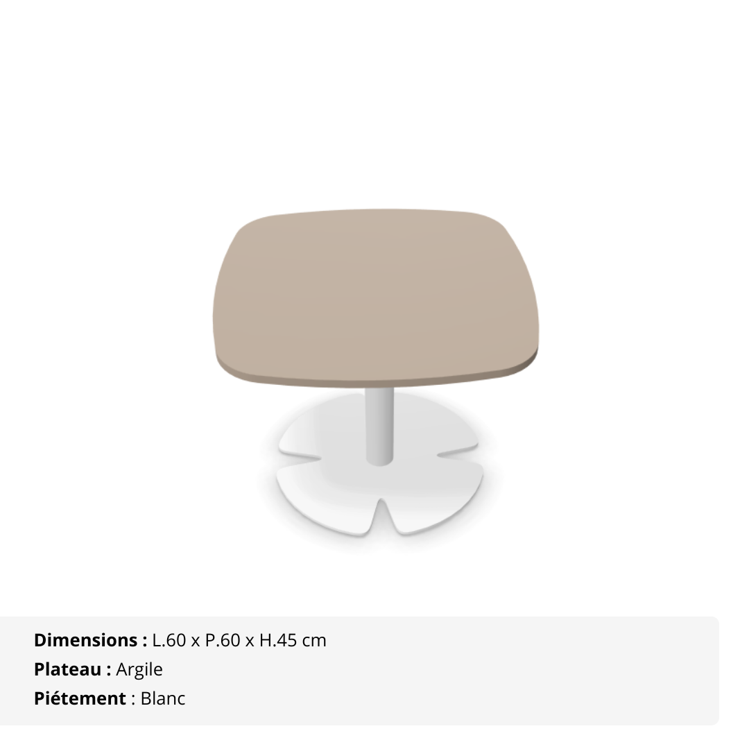 Installez une atmosphère chaleureuse et conviviale dès l’entrée grâce à cette table d’appoint carrée aux coins arrondis (berlingot), pensée pour sublimer vos espaces lounge, d’accueil ou de détente. Avec sa hauteur de 45 cm, elle crée un point de rencontre naturel et élégant, parfait pour déposer une boisson, une brochure ou simplement échanger quelques mots entre deux rendez-vous.