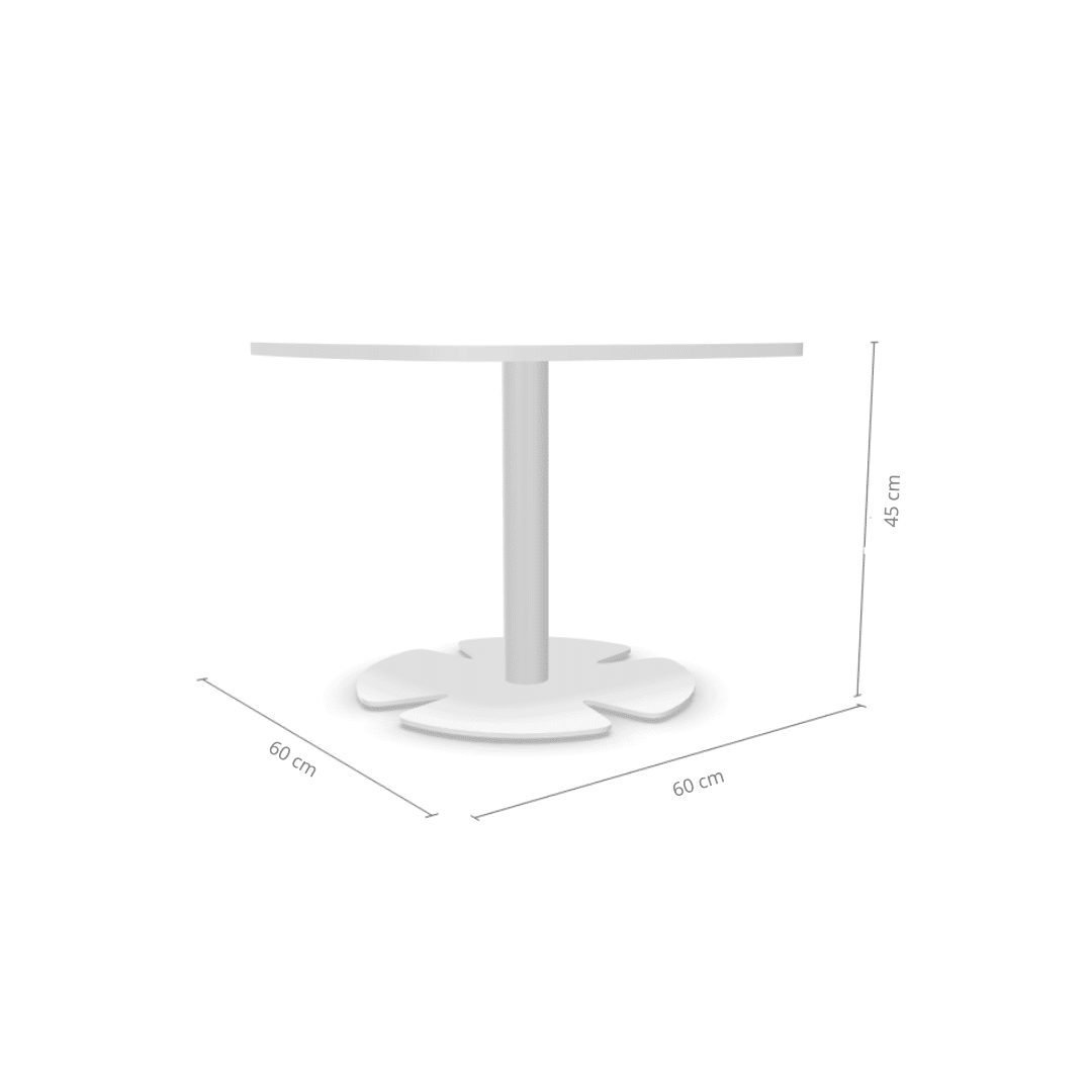 Son plateau mélaminé de 60 x 60 cm, avec une épaisseur de 16 mm et des chants ABS anti-choc de 2 mm, allie robustesse et douceur au toucher, tout en résistant aux usages du quotidien. Les coins arrondis apportent une sensation de fluidité et de sécurité, tout en soulignant le design contemporain de la table.