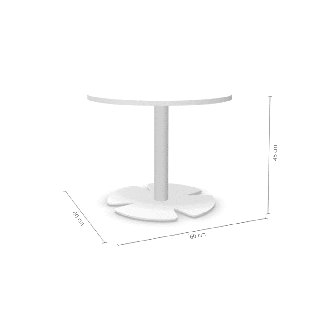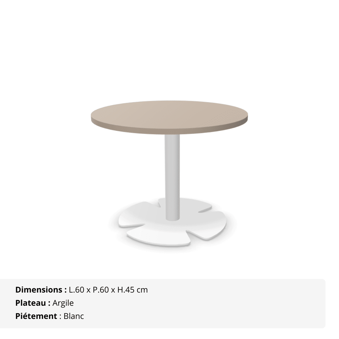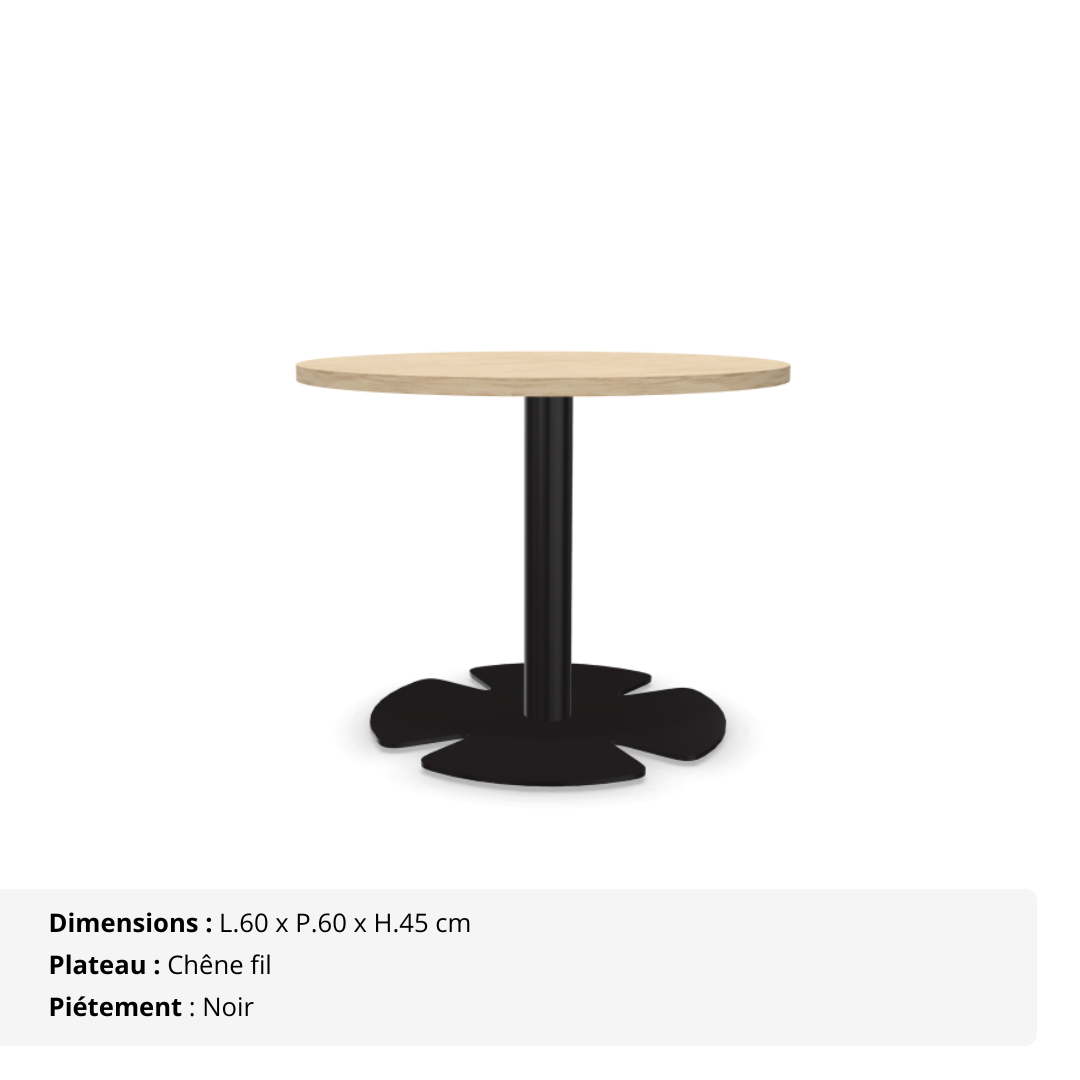 Le plateau circulaire de 60 cm de diamètre est réalisé en panneau mélaminé de 16 mm d’épaisseur, avec chants ABS anti-choc, pour une finition résistante et facile à entretenir. Il repose sur un piétement central en acier (tube Ø 60 mm) associé à une base en métal quadrilobe de 440 mm de diamètre, assurant une excellente stabilité.