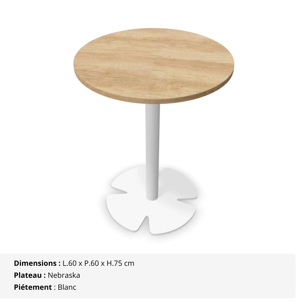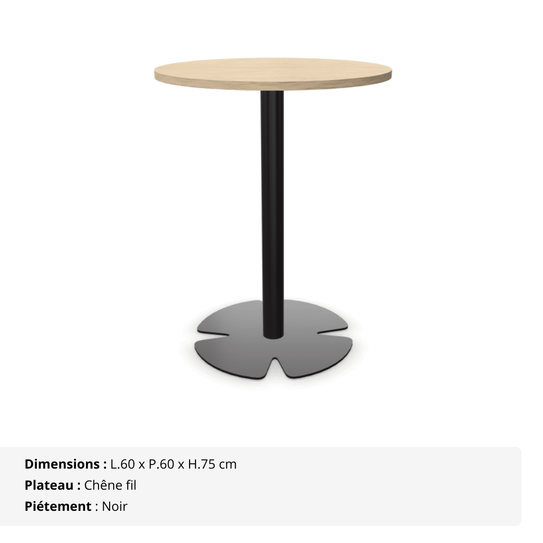 Son plateau rond en mélaminé, d’une épaisseur de 16 mm, est bordé de chants ABS anti-choc pour une protection optimale au quotidien. Elle repose sur un piétement central en acier (tube Ø 60 mm) et une base quadrilobe en métal Ø 440 mm, garantissant une stabilité parfaite, même sur sol irrégulier.