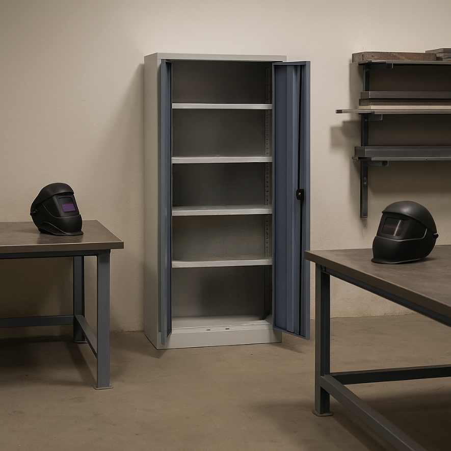 Armoire d’atelier comportant 4 Tablettes peintes réglables au pas de 50mm.