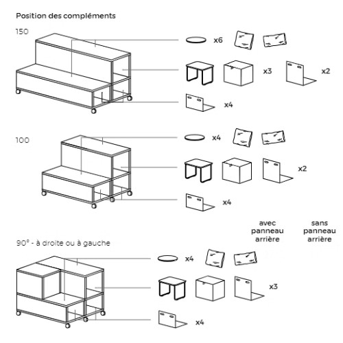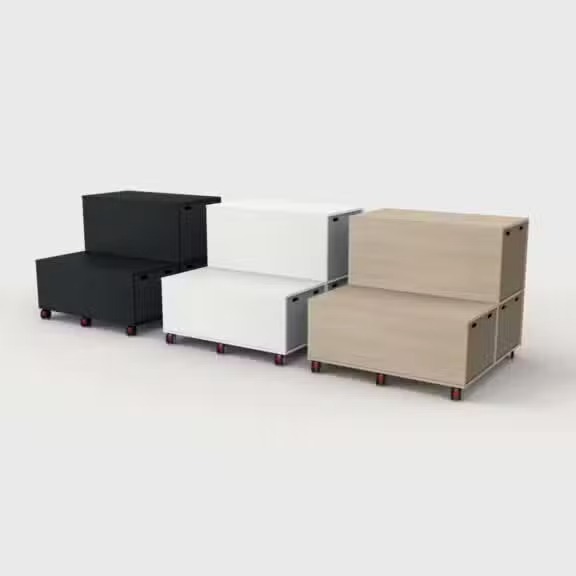 Disponibles en modules droits et à 90°, ils permettent de créer des configurations variées et d’optimiser l’agencement de votre espace. Polyvalents, ils peuvent être utilisés comme espace de réunion, zone de stockage ou séparateur d’ambiance, tout en intégrant des rangements pratiques pour des sièges, tables d’appoint et autres accessoires.