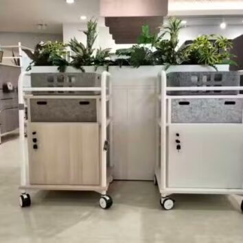 Grâce à ses roulettes pivotantes avec frein, offre une mobilité optimale tout en garantissant une stabilité parfaite. Son panneau frontal personnalisable permet d’intégrer votre image de marque avec des finitions en mélaminé, PET recyclé ou méthacrylate.