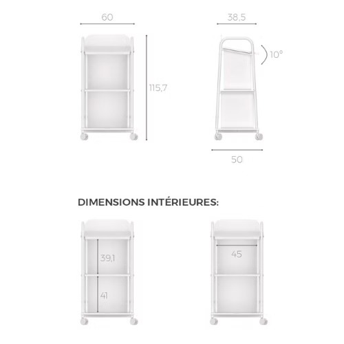 - 4 roulettes pivotantes Ø75 mm adaptées à tous types de sols