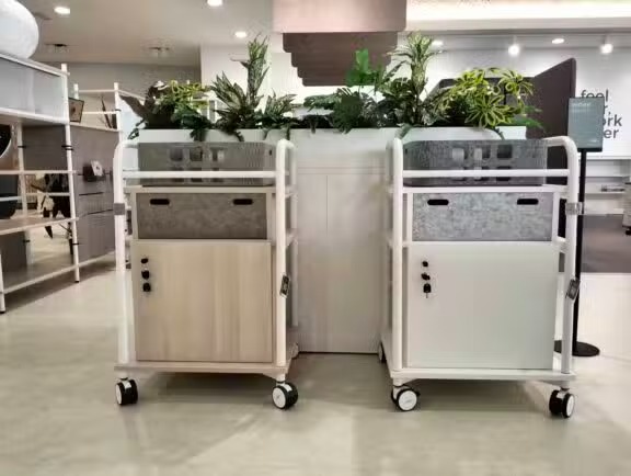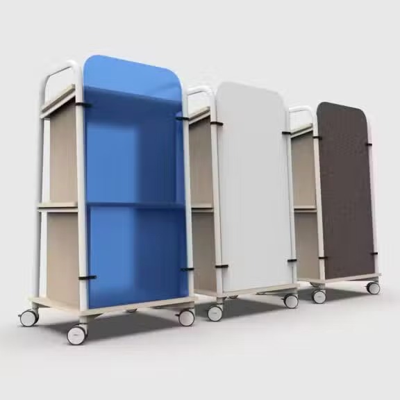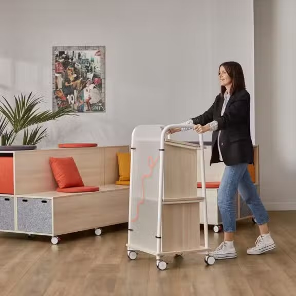 Grâce à ses roulettes pivotantes avec frein, offre une mobilité optimale tout en garantissant une stabilité parfaite. Son panneau frontal personnalisable permet d’intégrer votre image de marque avec des finitions en mélaminé, PET recyclé ou méthacrylate.