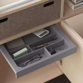 Ajoutez une touche de praticité avec le panier de la série Esmou, fabriqué en PET 100 % recyclé et recyclable. Ce complément discret et fonctionnel s’intègre dans l’espace creux du pupitre et permet de ranger vos effets personnels ou accessoires en toute simplicité.