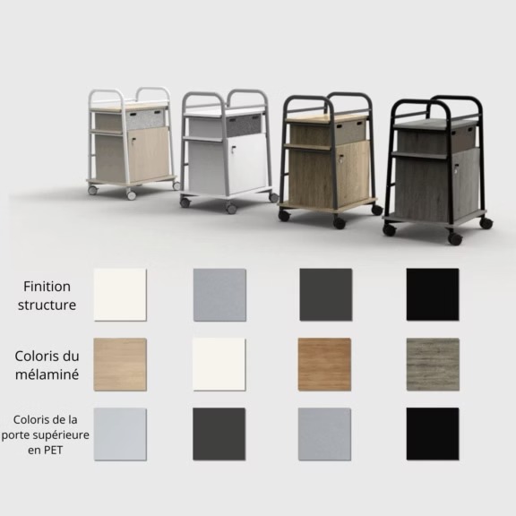 Disponible en plusieurs coloris et finitions , ce trolley de rangement mobile s’adapte à tous les environnements de travail . Son design personnalisable en fait une solution aussi fonctionnelle qu’esthétique , idéale pour optimiser l’organisation de tout espace professionnel.