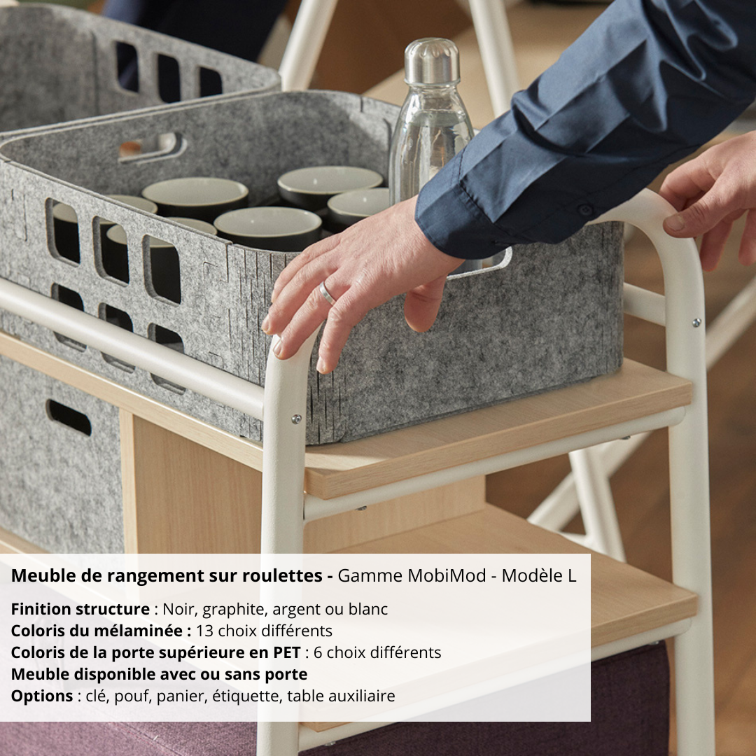Le MobiMod L se distingue par sa porte supérieure en PET 100 % recyclé et recyclable , offrant un accès rapide aux documents et accessoires. Son placard inférieur sécurisé , doté d’une porte battante verrouillable à clé et d’un plateau plumier intégré , permet de ranger en toute confidentialité effets personnels, fournitures et dossiers importants .